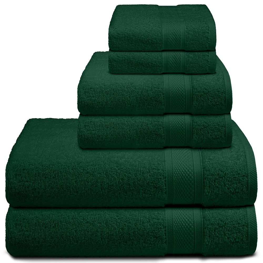 This 6-piece hunter green towel set includes 2 bath towels (27×54 inches), 2 hand towels (16×27 inches), and 2 washcloths (12×12 inches), offering a full solution for guestrooms, spa treatment rooms, yoga studios, or shared wellness spaces. The coordinated set ensures consistent presentation while supporting easy inventory management for eco-conscious hotels and resorts.