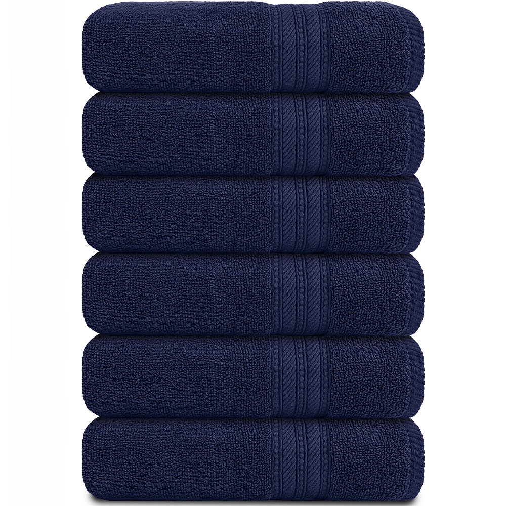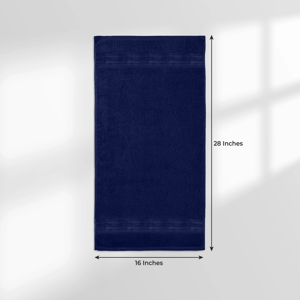 Decorative cross-stitched hems prevent fraying, and the 16×28 size is ideal for hand use across commercial environments. These towels combine plush comfort, operational durability, and an elegant navy color, making them a professional, eco-conscious, and long-lasting solution for everyday bathroom needs.